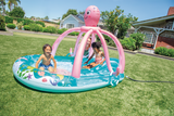 בריכת פעילות צבעונית לילדים עם מגלשה, מתז מים מובנה ומשחק קליעה בטבעות. פתרון מושלם לקיץ בגינה או בחצר עם עיצוב תמנון שמח, חוויית מים מהנה ומרכז משחק קטן שמכניס הרבה עניין לילדים.